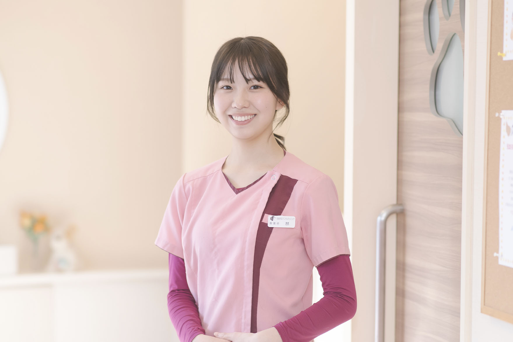 看護スタッフとしてのやりがいは、病気で来院した動物たちが治療やお世話を受けて徐々に回復していく様子をそばで見守れることです。元気になった姿を見るたびに、諦めずに頑張って良かったなと思います。またトリマーも兼任しているので、満足いくトリミングができたときに、飼い主さんに喜んでいただけると達成感を得られます。この仕事を選んだきっかけは、飼い犬が幼少期にアトピー性皮膚炎になったことです。母と動物病院に通い、診察や治療に加えてトリミングをしてもらう様子を間近で見るうちに、自分も動物や飼い主さんの力になれる看護スタッフ兼トリマーになりたいと思うようになりました。動物看護とトリマーの資格取得の両方を学びたかったので、東京愛犬に入学しました。